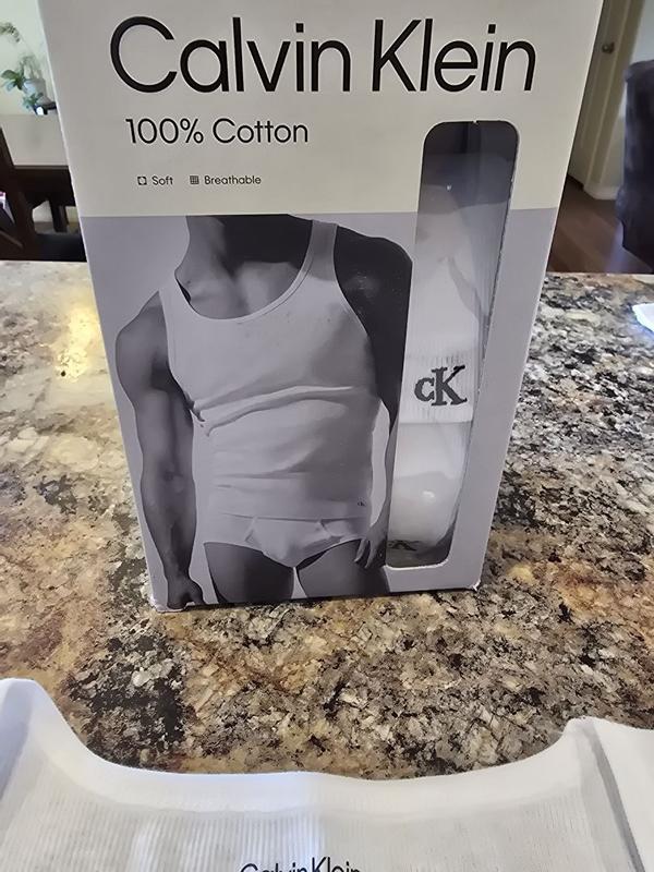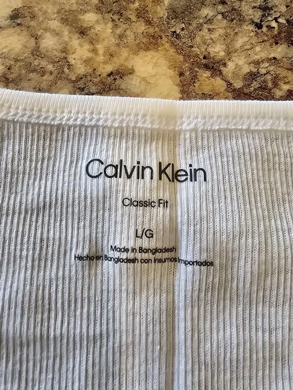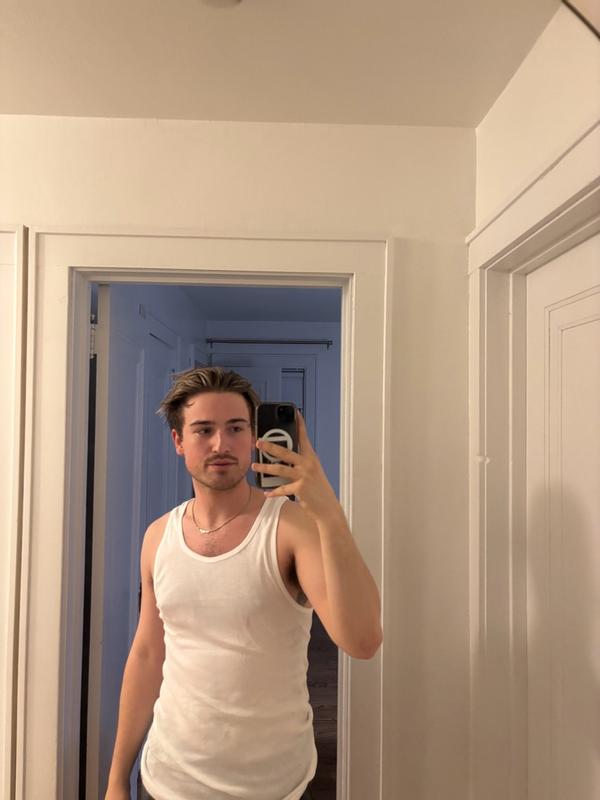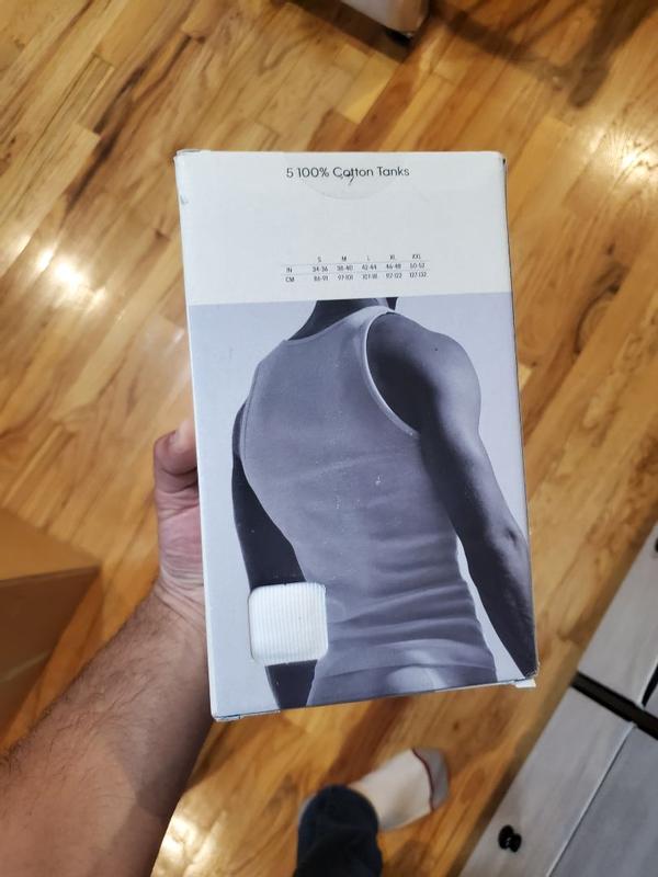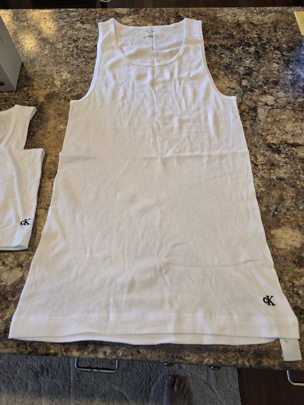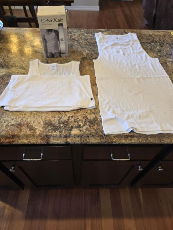 Calvin Klein is always a good fit. Roomy arm holes and long enough length. Soft cotton too.