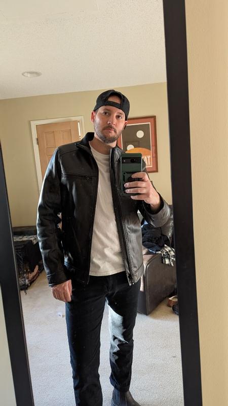 Cant beat it,looks like real leather.Sale price was amazing. Bought two one for me,one for son,just ordered a second one for myself. Medium is great for me,if you have a tummy maybe a large.Nice quilted lining but more for fall,not for winter use. Double pockets and adjustable sides are a +++,to make bigger if you need.