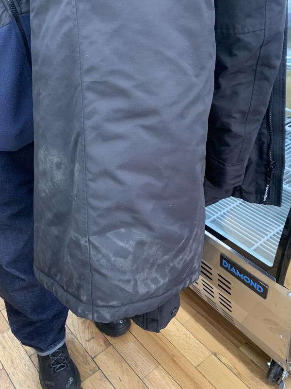 The coat must of been dropped in the warehouse where packaged, tge whole back of tge coat and arm was soiled then a shipping plastic was placed over the coat then shipped