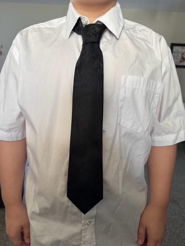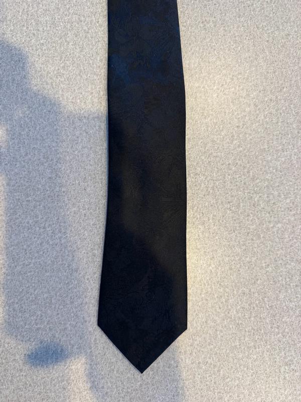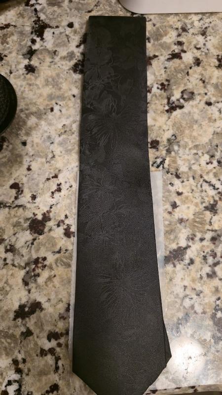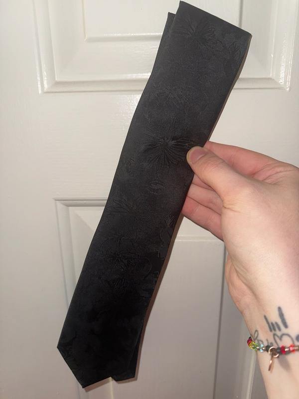 This tie arrived just in time for a formal wedding we were attending. This picture showed the best detail of the tie since it is black. I was so obsessed with my husband in this sleek and luxurious tie. Made the entire outfit come together in an elevated fashion. It is soft and my husband made no complaints about it being uncomfortable. Highly recommend!!