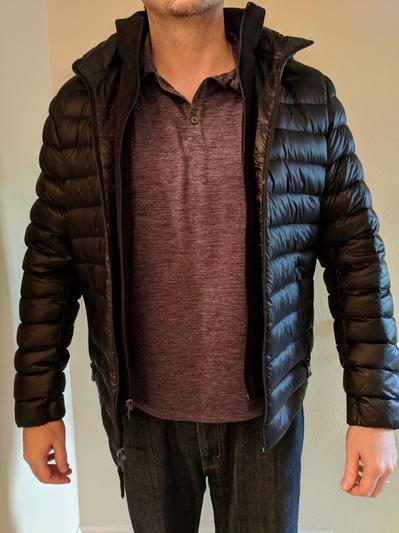 With the cold weather finally here, I was able to break out my new jacket. Warm without being overly so, it is lightweight and comfortable. Fits fine with either a shirt of T-shirt, but will run a little bit small if wearing a shirt and sweater. It is a welcome addition to my coat selection once it gets around 50 or so.