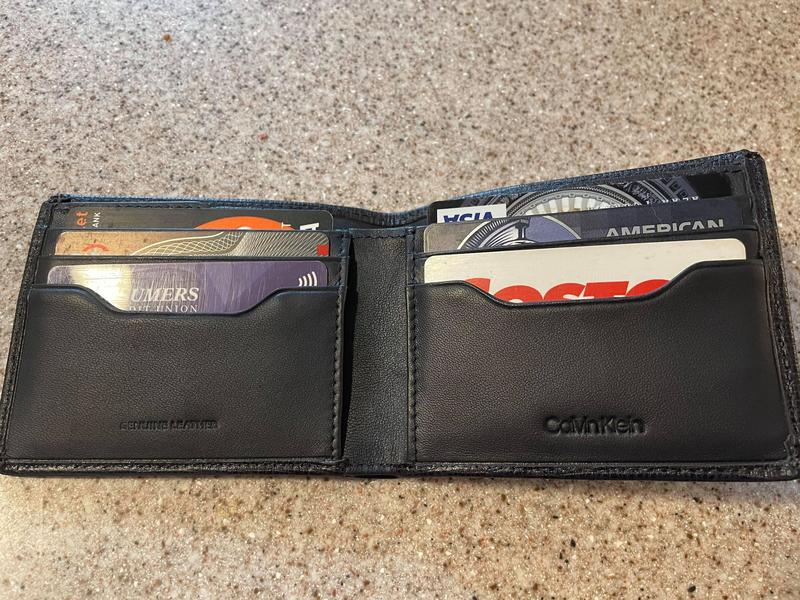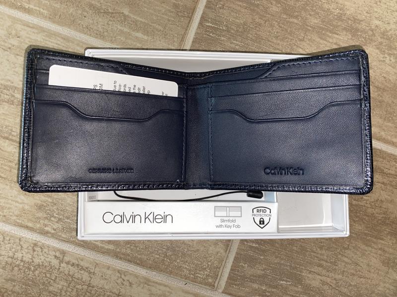 My Review for Calvin Klein Men's RFID Leather Slimfold Wallet with Metal Key Fob. This is a very good solid wallet. Love the color and the feel of it. The inside compartments are enough plenty of room.
