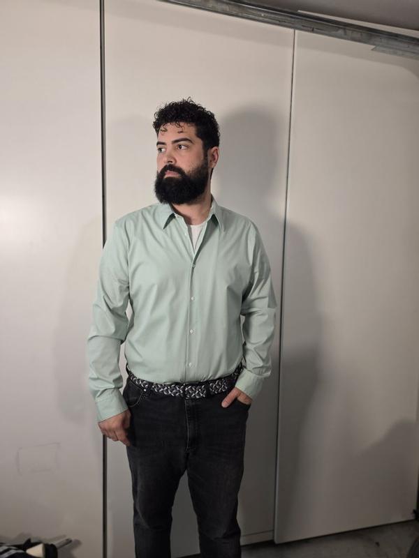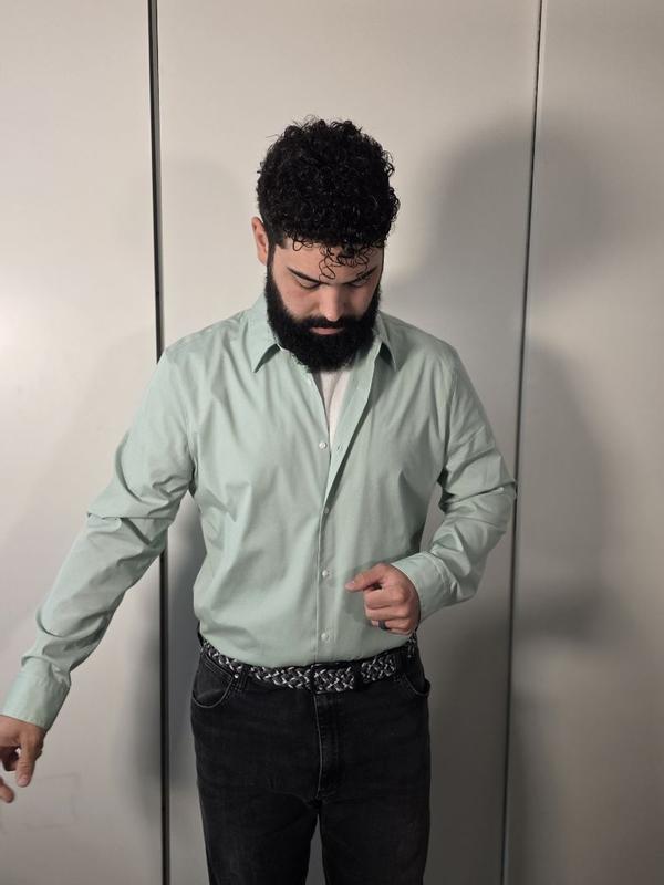 The Calvin Klein Solid Supima Stretch Woven Shirt is a beautiful and comfortable shirt. The material feels soft and comfortable. It also looks durable even after washing. The cut is flattering, with a loose and relaxed fit. The shirt is versatile and can be dressed up or worn casually. When worn untucked,, it falls at the right spot to look natural. My only disappointment is the color. The green leans too much toward the mint green shade. I wish it was a more muted shade. The size is true to size. I wear a medium and it fit me perfectly. .