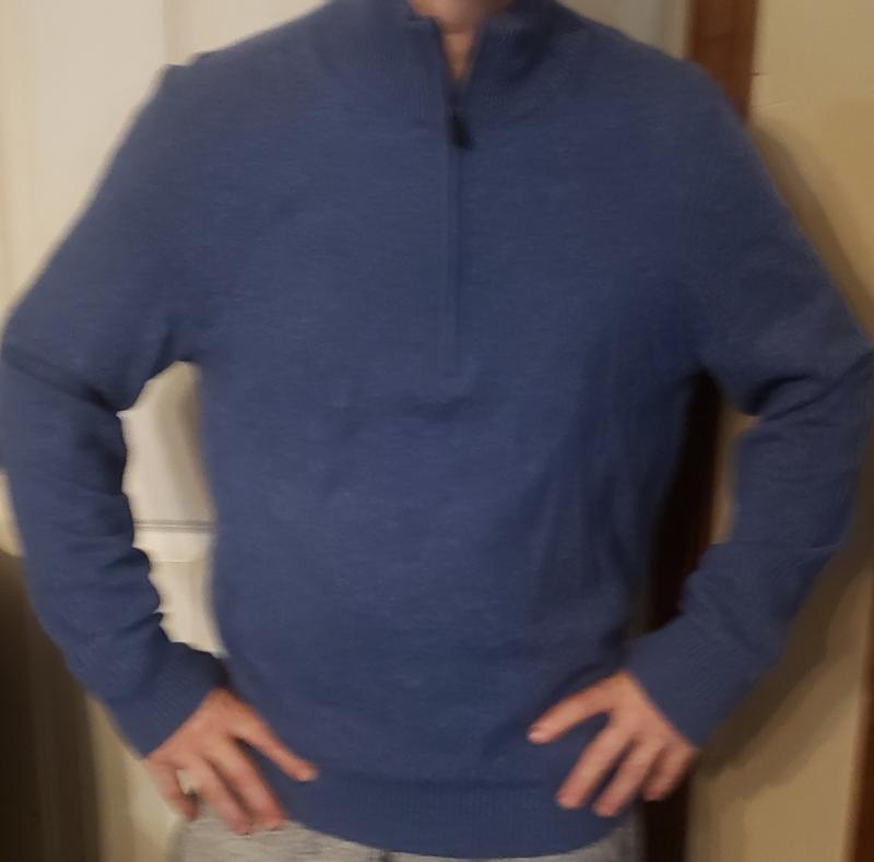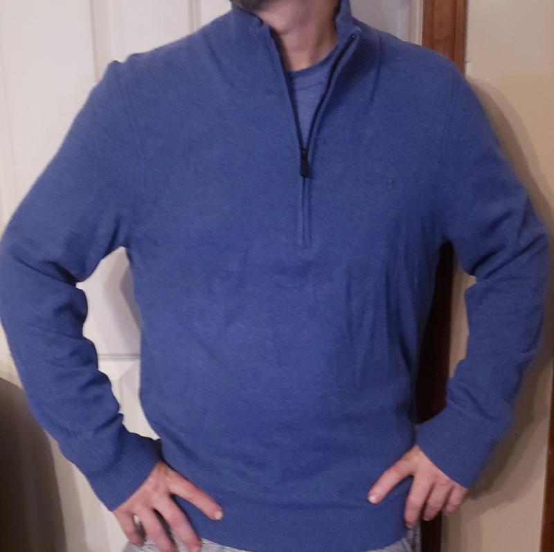 The blue color on the half zip sweater is stunning. This is a great transition piece for fall. It's not super heavy, but can be layered to add more warmth in the winter. Fabric is nice and soft. Washes up nice too. I didnt notice any fading or shrinking when I washed it. This is a really great addition to my fall wardrobe.