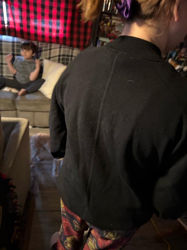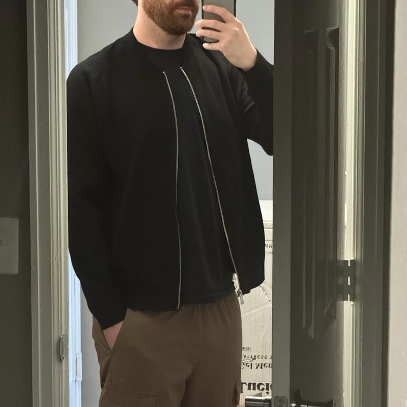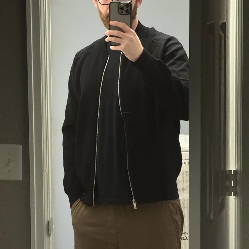 I was pleasantly surprised by how good of a lightweight layer this ended up being. It feels like a cotton knit, and has a minimalist bomber style, with the only obvious contrast being the chrome zipper. Although it’s knit, it feels durable because it’s a pretty tight pattern. I would recommend it if trying to dress up an outfit and add a little warmth too! It feels nice enough to wear in a business casual setting.