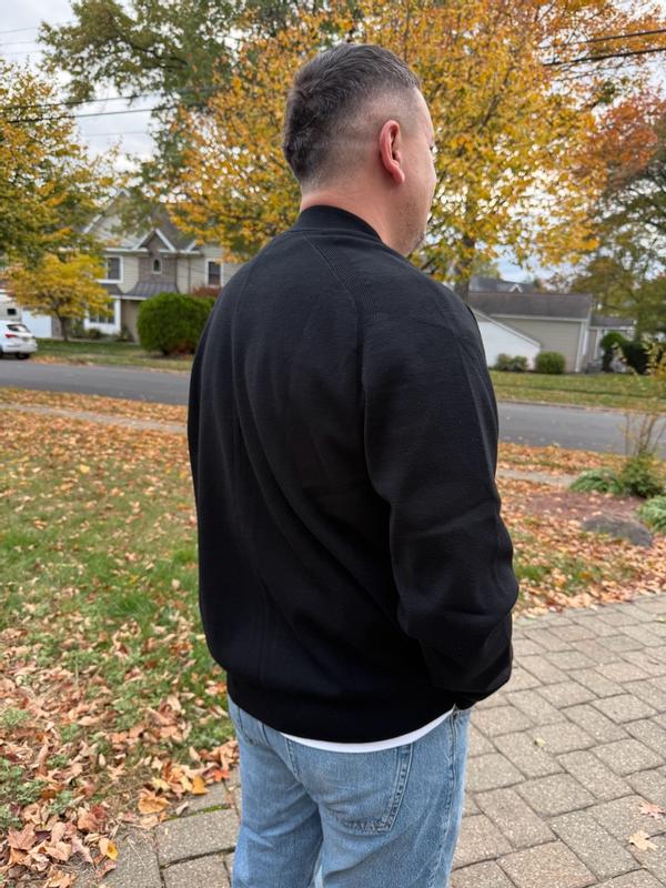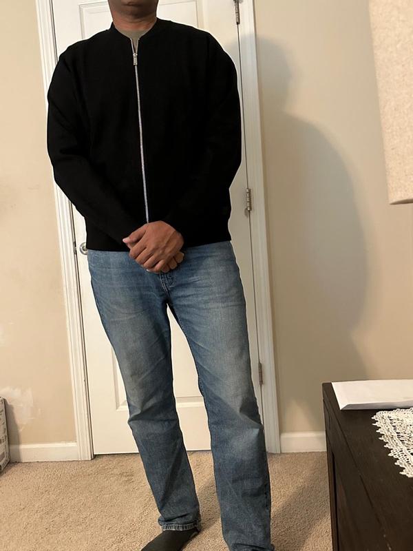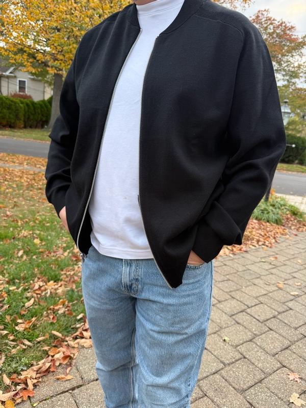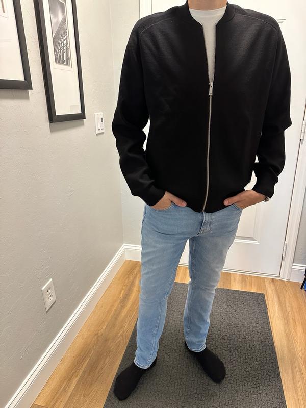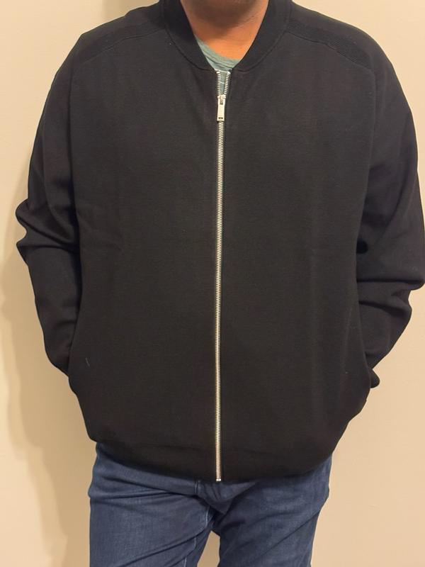 Love this Calvin Klein black bomber, I wear size L. Super comfy knit, not too thick, perfect for layering. Zips smooth, fits great, looks sharp. I can wear it up and down with T-shirt or shirt. Feels high quality, very soft and well made. Would buy again different colors I give it 5/5.