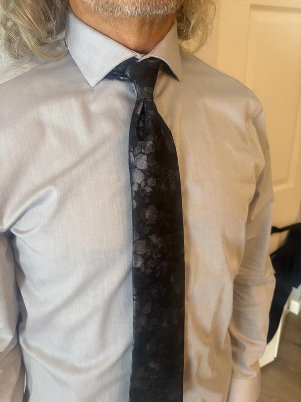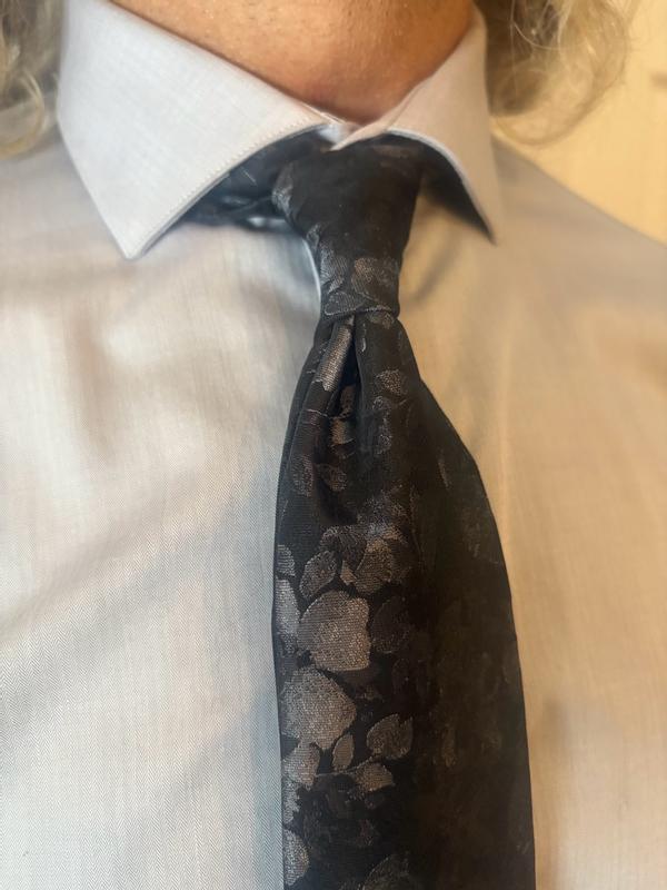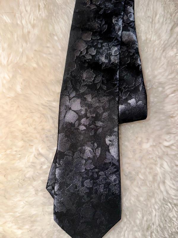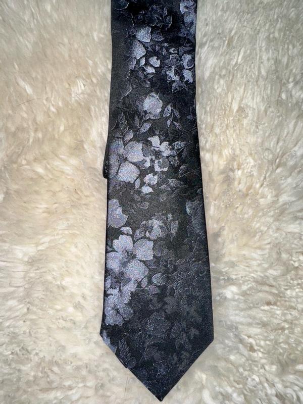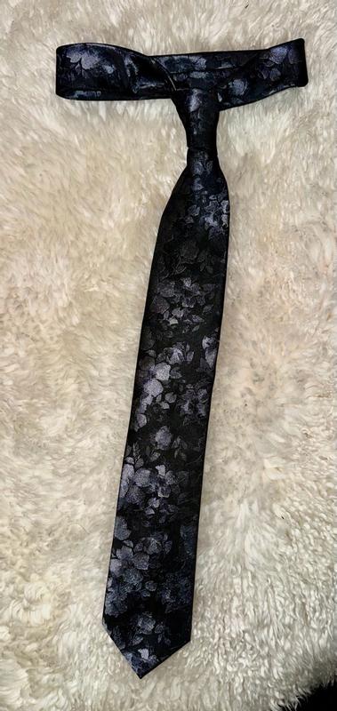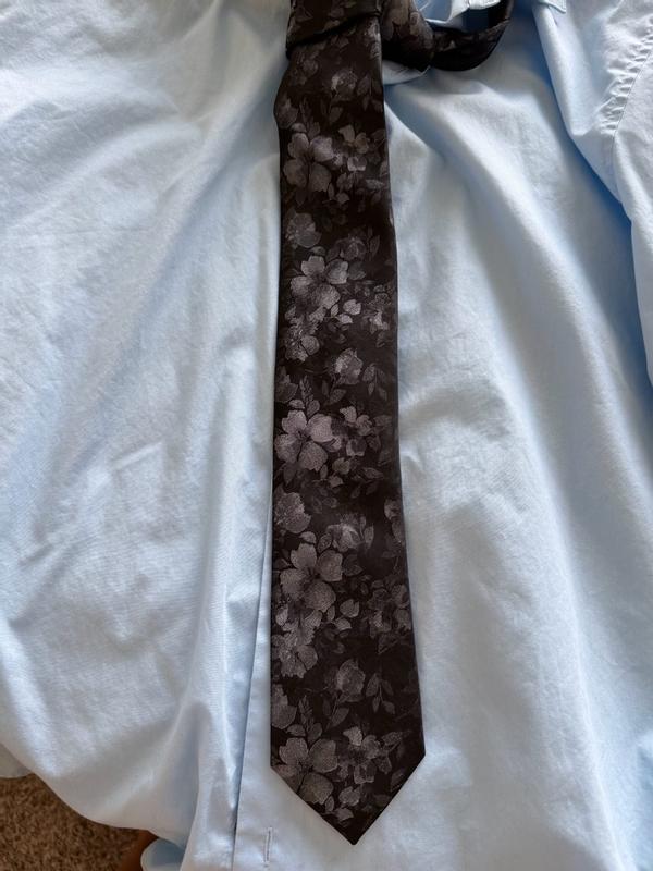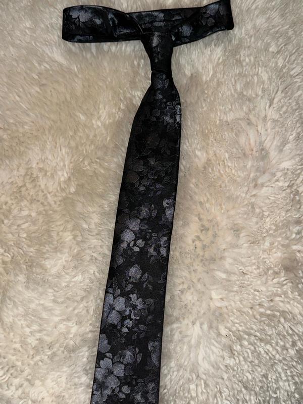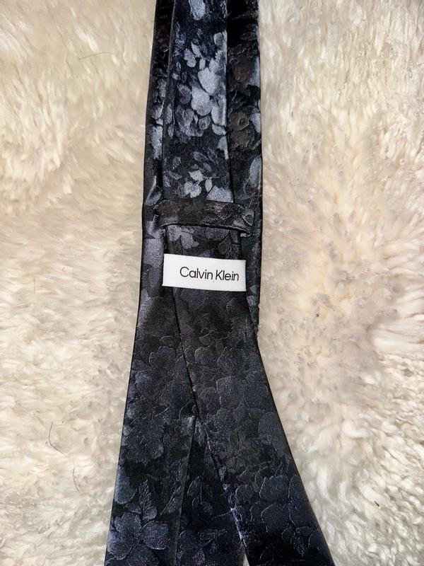 The Calvin Klein Black Floral Mens Tie is both stunning and beautiful. The colors and pattern are subtle at first glance, then when the light catches the pattern in different light it brings out a metallic 3d flower pattern. I was able to easily wipe off a food spill I had while wearing it. I have worn it several times in the last month and it looks as beautiful as when I first took it out of the box.