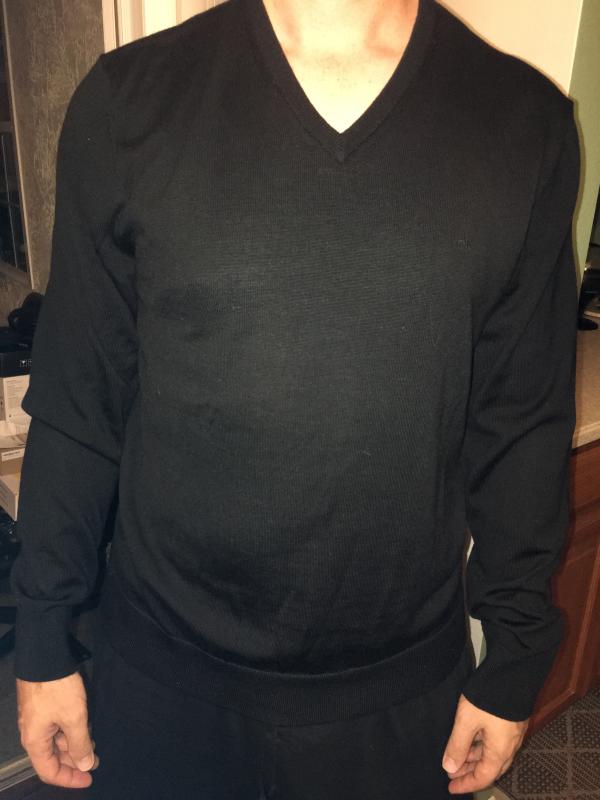 The material on my Calvin Klein Merino V-Neck Sweater has a soft, thin and lightweight feel to it. The arm and torso length is spot on and the v-neck depth is a perfect fit on me. I like that the color is a solid color, mine is heroic gray, as I feel it gives me more variety choices when it comes to pairing up what I wear underneath it. It also has the initials CK located on the left upper chest area. The sweater is quality made and can be machine washed and dryer dried. Mine has been machine washed and dried numerous times without any shrinkage or misshaping.