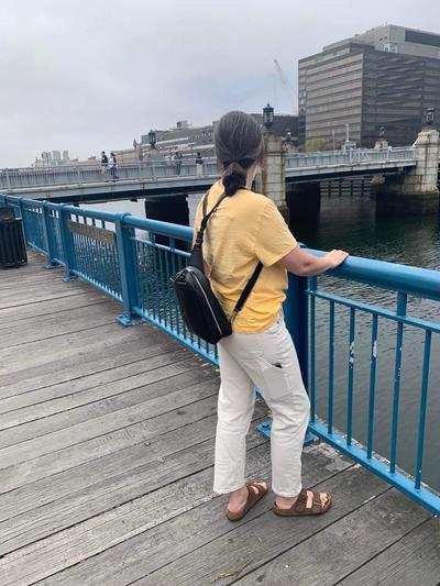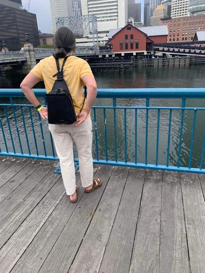 I wear XL & the strap isn’t adjustable & a little short for my size. I love that the strap unzips to convert to a backpack, but be careful with certain fabrics because the zipper teeth are pretty rough and will catch. Love the very deep pockets front & back. I think it’s a very attractive bag. It’s not real leather & the deep pockets have a strong funky smell. Picture is to show zipper teeth & stitching on back pocket, since it doesn’t look or smell like leather.