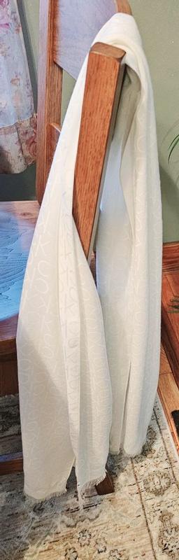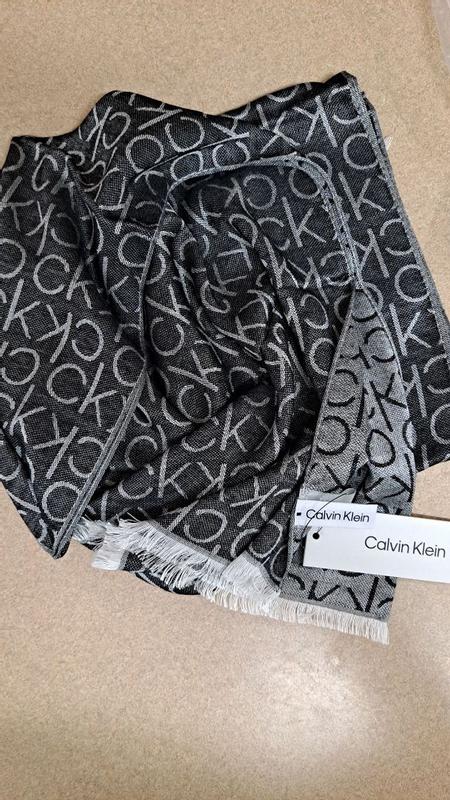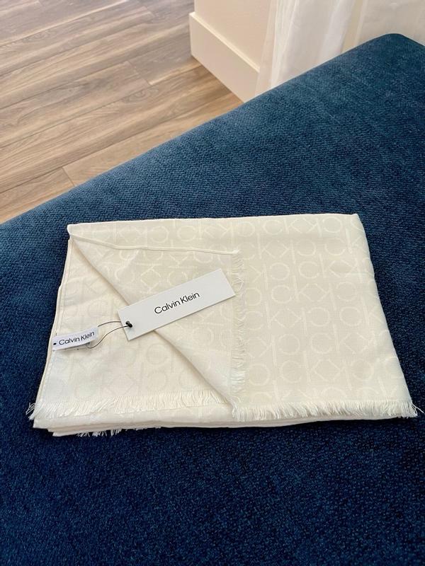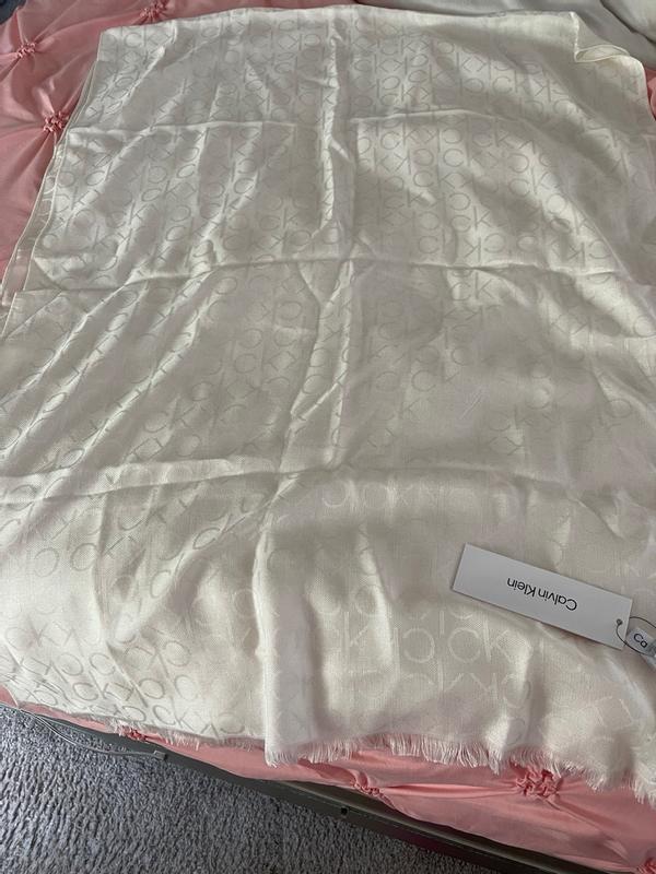 Purchased in cream and the logos CK are very subtle. Good size, marvelous basic in cream. Could use as a pashmina or a layering piece. Would suit woman of every smoking tone came beautifully as it is a gift ❤️🙏