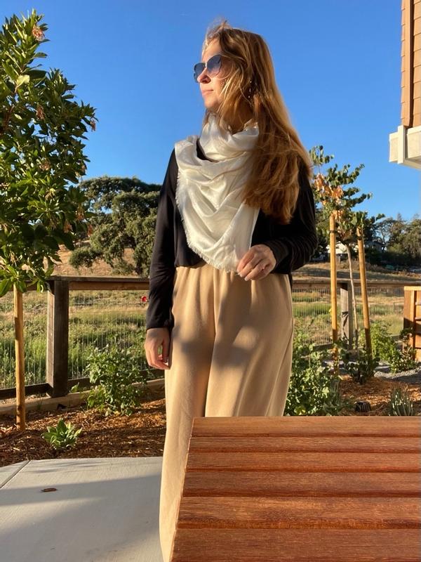 Very soft and versatile. Can be worn so many different ways. Material is strong . Design is cute!! Goes well with any outfit. Have gotten many compliments already.