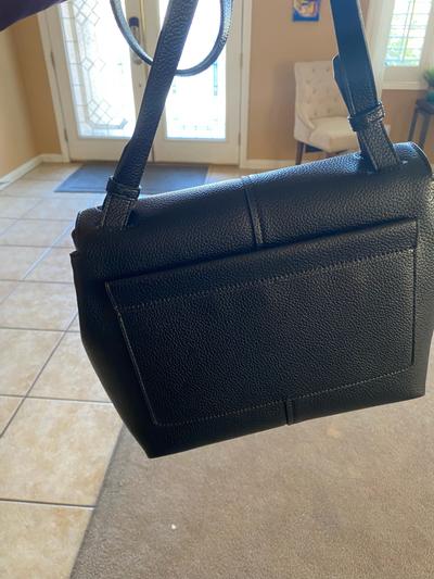 Nice and roomy crossbody bag. It’s not leather but soft like it is. Strap can be adjusted in length. Has room enough to hold standard size iPad. Not super lightweight but not too heavy either.