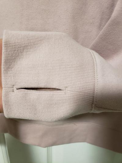 This sweatshirt is super soft and comfortable. Crosssover neckline, slit waistband and long thumbhole sleeves are also super soft and cut for comfort. As comfortable as a men's sweatshirt but style and softness for a woman!