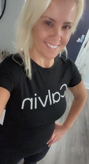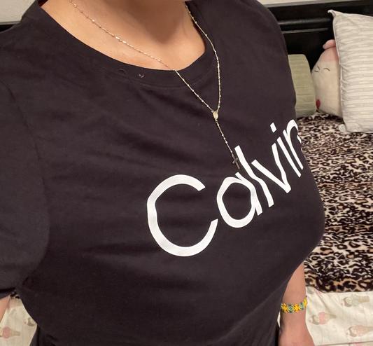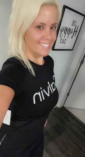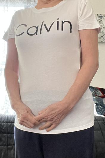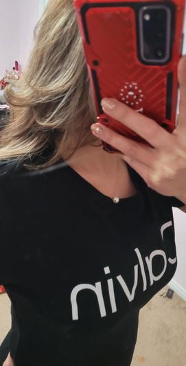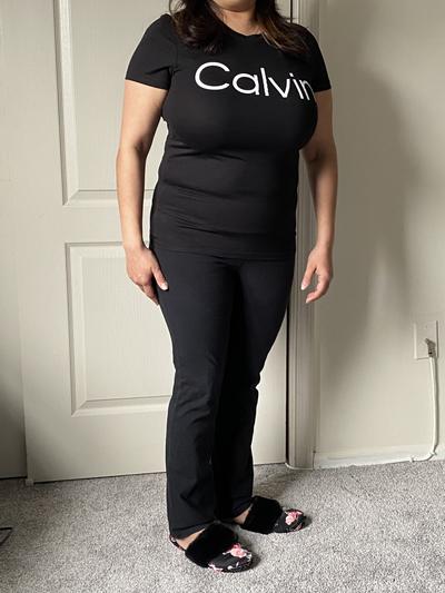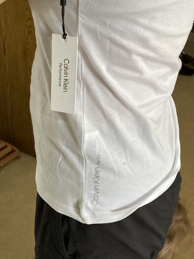 This is another great staple from CK. It is a soft cotton with the logo on front, runs true to size. It hangs well and hits at the hip. In a time where all the tops are cropped, this is a nice change of pace. For me, a cropped top does not do the job during a Peloton spin class.