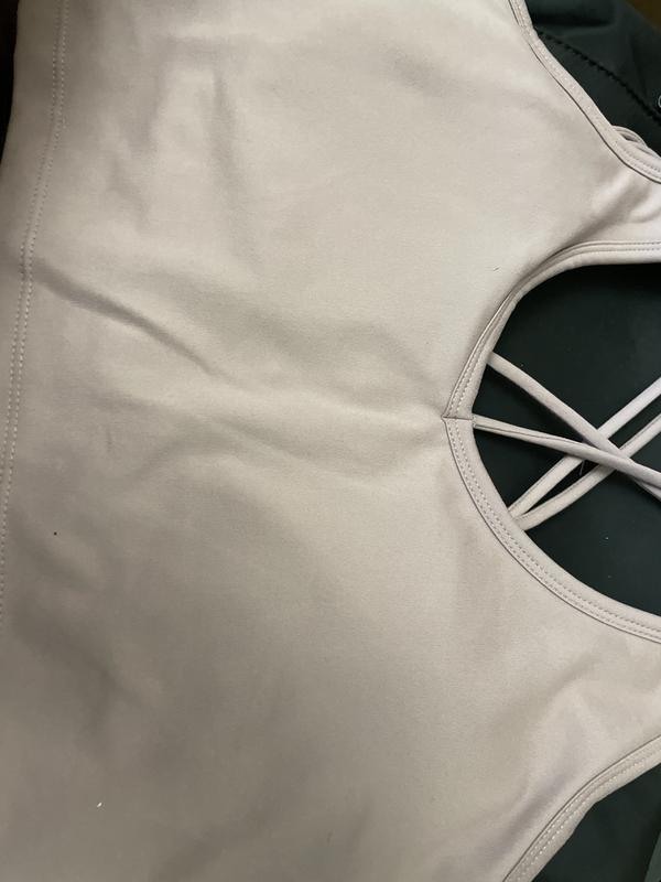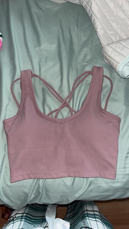 I absolutely love the dusty pink color of this sports bra and the fabric feels amazing. It's a great crop top length as well. True to size. I gave it 4 stars because it is a bit too strappy in the back.