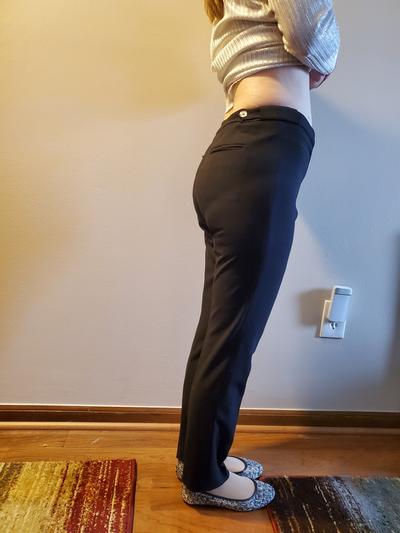 These business/dress pants are such good quality. The fabric holds shape and hides any undergarment lines. The waist is a perfect width and allows for tucking in of shirts and blouses. The cut of the pant accentuates the leg shape so that it provides a chic business suit-like look. Perfect as a suit bottom. Size runs small, so size up.