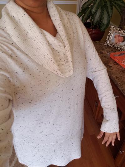 To me, this is just another sweater. There was nothing about it that stood out to me. It is light weight (a little too light weight for my liking) and the “shimmering” flicks don’t shimmer. The asymmetric hemline is flattering and I like the turtleneck.