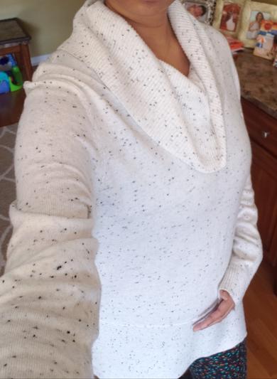 I loved the lightweight material of this sweater for fall and winter. The size was right on target for an XL. I received so many compliments on the look of this sweater. I can dress it up or dress it down. It has a rich cream color base with black flecks than can be worn with many other colors. Adorable! I definitely recommend this lovely sweater!