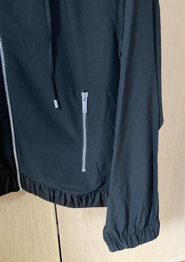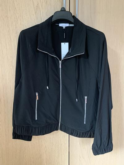 This is a casual, unlined 88% polyester/12% spandex performance-type fabric look & feel sporty jacket. It has been perfect for wearing over a tank top and shorts to the gym or running errands. The spandex offers some give but is not overly stretchy. There is an elastic waistband as well as elastic cuffs on the sleeves. My favorite detail is the collar which can lay open or stand up when fully zipped. There is also a drawstring on the collar with embossed aglets. The two pockets are functional as well as stylish with the contrasting silver zippers and embossed pulls which add a refined look. I am 5’5”, 123lbs and typically wear a size small. The size small is true to size and is super comfortable. As with many Calvin Klein styles, this jacket is casually sophisticated, on-trend yet classic. I live in Florida and have numerous light jackets to combat going from heat and humidity outside to cold air conditioning inside. From a practical standpoint I can see this being a wardrobe staple.