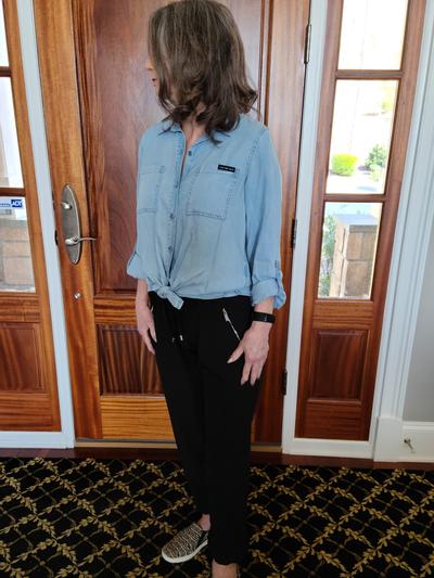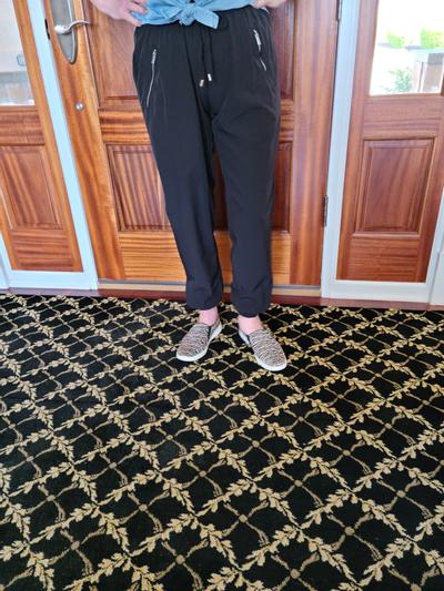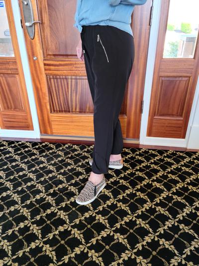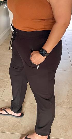 These are my new go to travel pants. They are so soft and comfortable. The zippered pockets are an added plus. I like the elastic at the bottom of the legs so I don't have to worry about hemming.