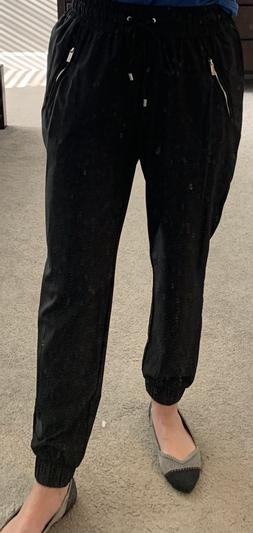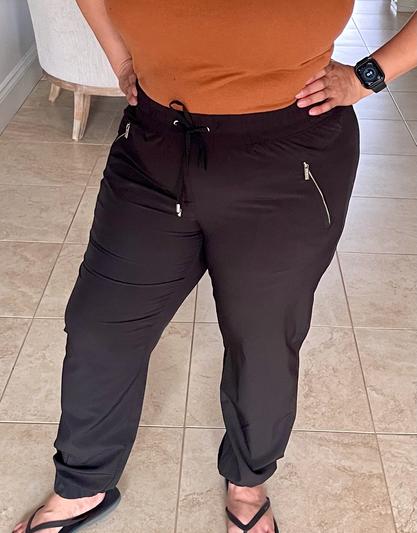 I recently got this Calvin Klein jogger pants, and while I was expecting the materiel to be super comfy, I ended getting a more plastic feel to it. It’s definitely true to size, and has zipper side pockets. Even though it’s not as comfy as I wanted to be, it still a nice jogger pants to travel with, do errands and even pair with a nice heel for a night out.