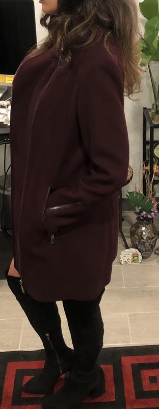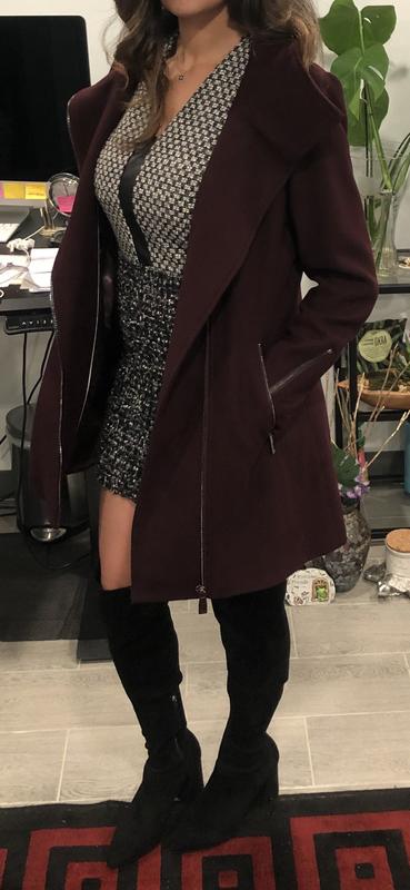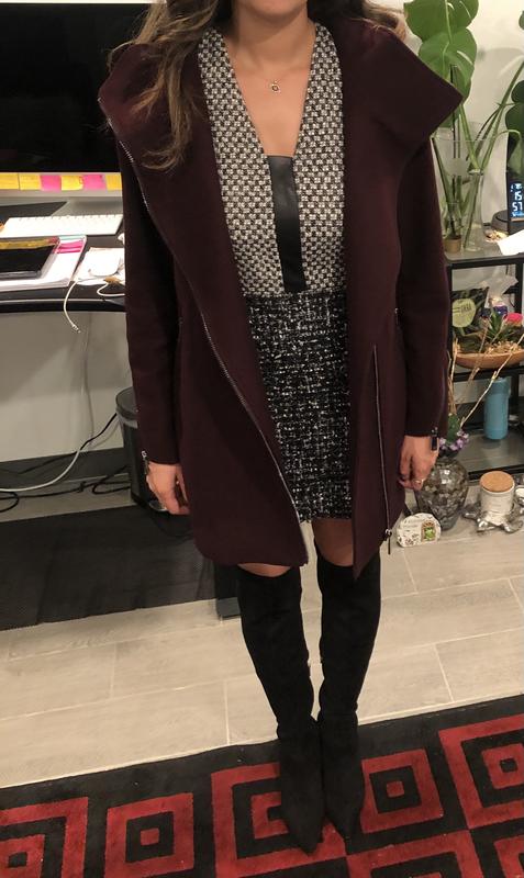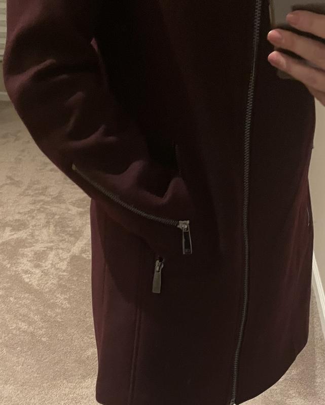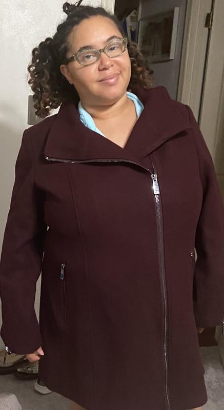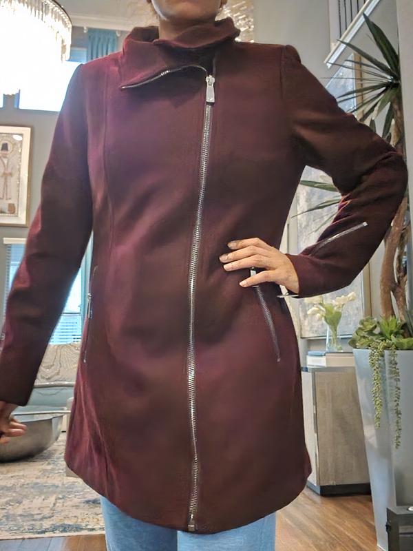 Really cute coat, love the asymmetrical zipper. But runs small. It was small across the back and the sleeves were tight (on upper arm).