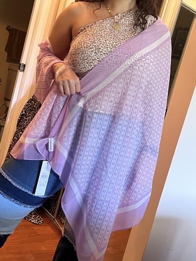 Scarf is so pretty! Nice orchid color, perfect to jazz up your spring outfit. Silky soft.