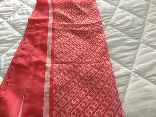 I received this soft scarf in porcelain rose. The color is actually a shade of salmon. The scarf is soft and flowy. I enjoy wearing it covering my shoulders as a shawl. The size is 70 inches long and 26. inches wide. There is a chain link pattern in the middle of the scarf. This scarf will add a pop of color to any outfit you have on.