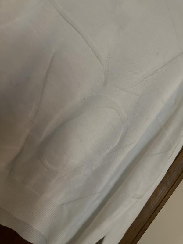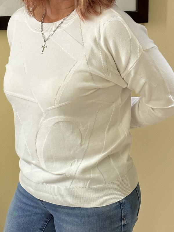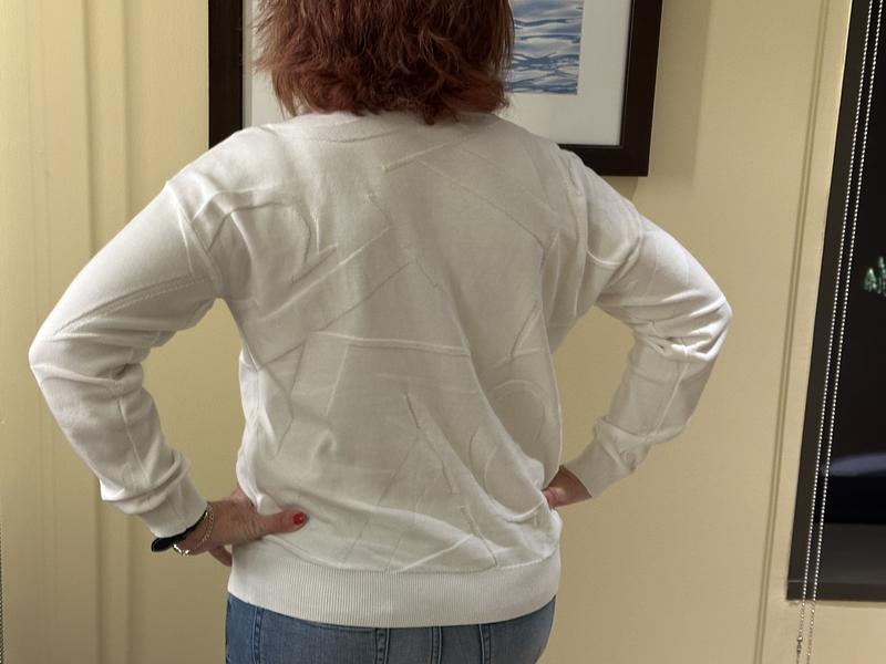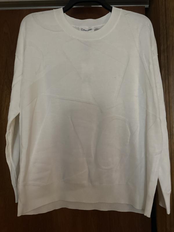 I am glad I did not pay full price for this sweater. The knit is so thin it is see-through. It has enough stretch to maintain its shape, and the CK logo is textured and is not obviously a logo. If you do not care for logos, like me, you will be pleased with the texture and subtle design. The color is saturated and slightly shiny. The sweater looks like a quality garment other than being too thin. I wear a Medium, but I always size up in sweaters, just a personal preference for a looser fit. The Large fits very well, without being baggy or sagging. I purchased the black color. I will keep this item, but I will not purchase another color like I had planned to originally. For reference, I am 5 feet 4 inches tall, a 36D, and I weigh about 132 pounds.