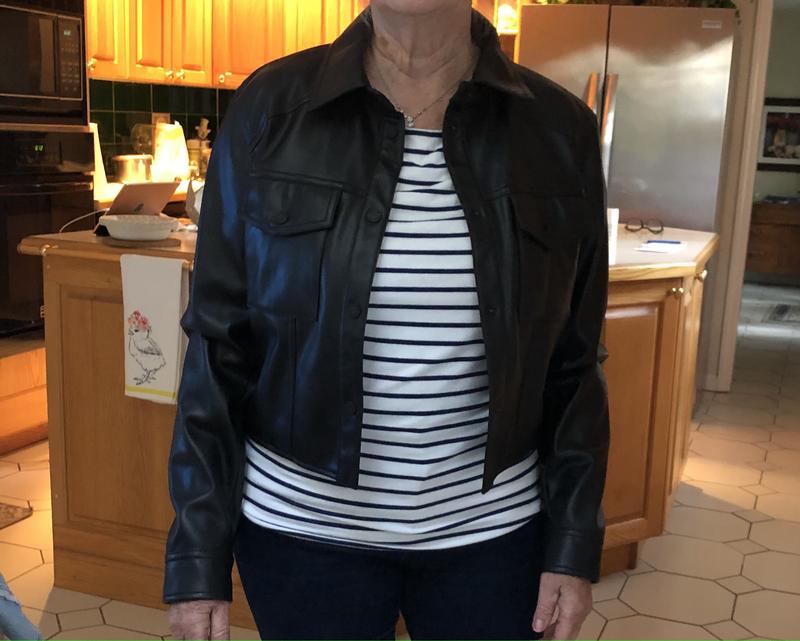 This jacket is super comfortable and light weight. Goes well with any outfit. I love to wear it with sweater dresses, the cropped length makes it appear less boxy. The faux leather feels real, it also keeps you warmer than expected.