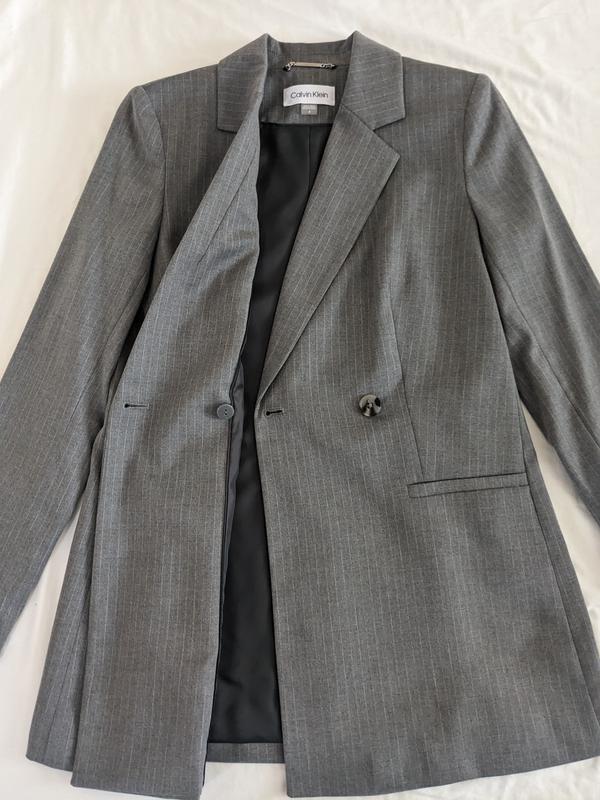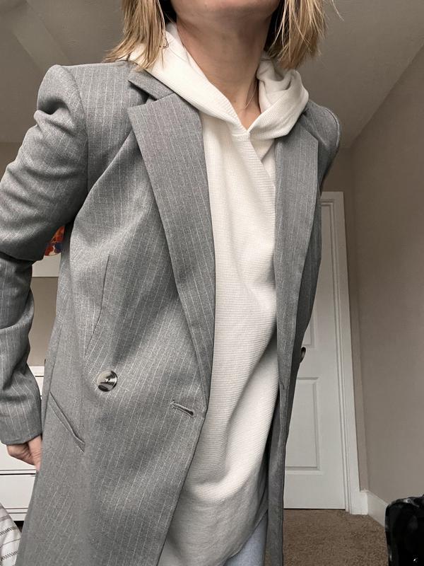 This is a very nice blazer. Love the length. Made very well and is comfortable. Color is a nice medium gray with pinstripes. Versatile, I can wear to work or pair with some jeans and wear out. Highly recommended.