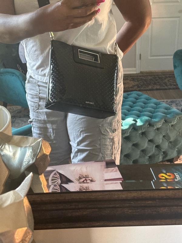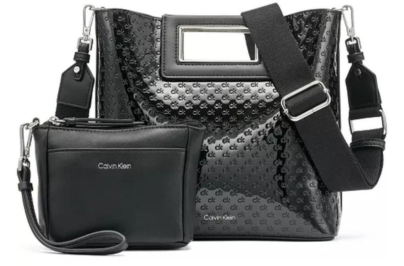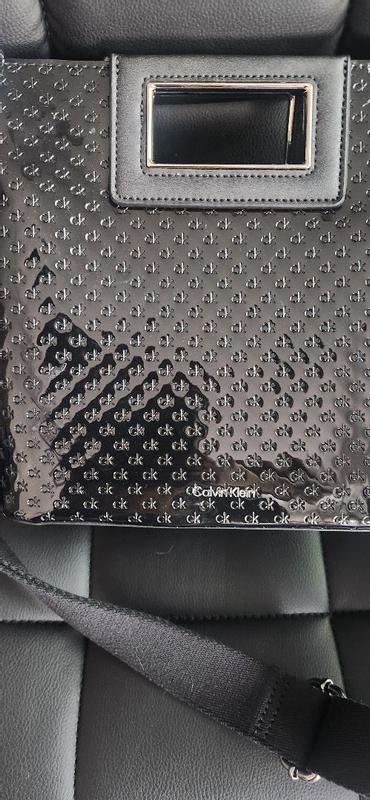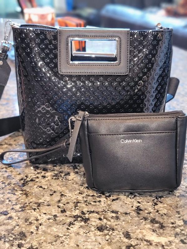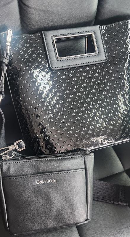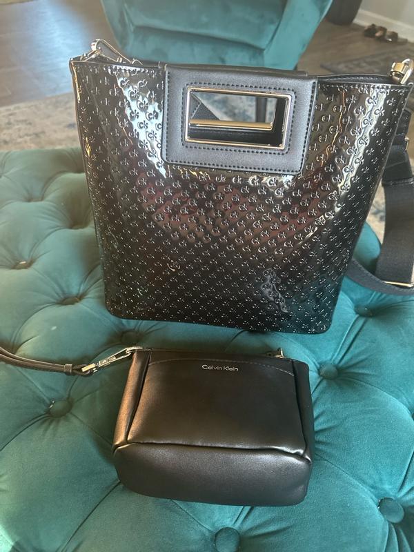 What a beautiful Calvin Klein EIRA Crossbody purse. It is the perfect size. Not too big or small. The small pouch is a perfect match for cosmetics or personal items. It is made with quality materials. This is a black patent leather with small ck lettering. I will be using it during my travels this week.