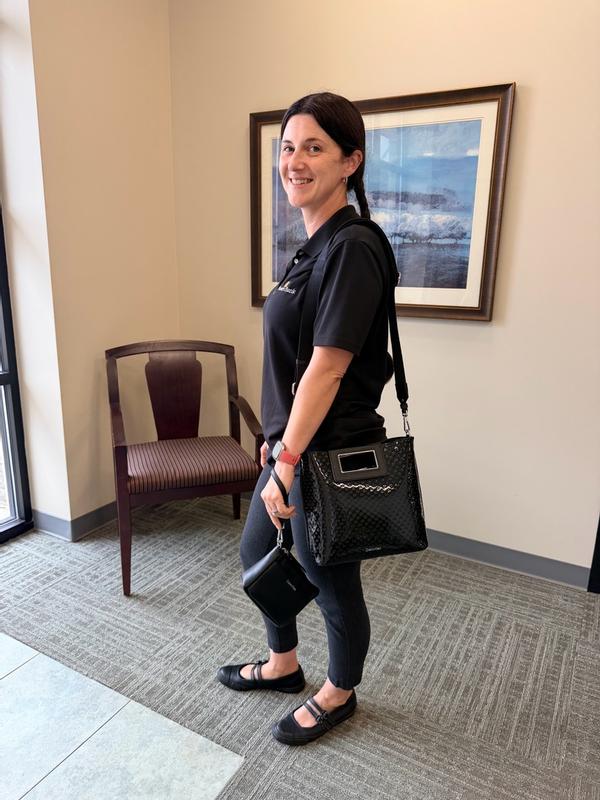 Beautiful bag! I love the crossbody style, because it feels more secure to me rather than a shoulder bag. It is also secure in the fact that it closes well but also makes everything easily accessible with the magnet/zipper closure. It’s light but still sturdy, and the black color goes with everything in my closet. I feel that it can be dressed up or down and serves its purpose well.