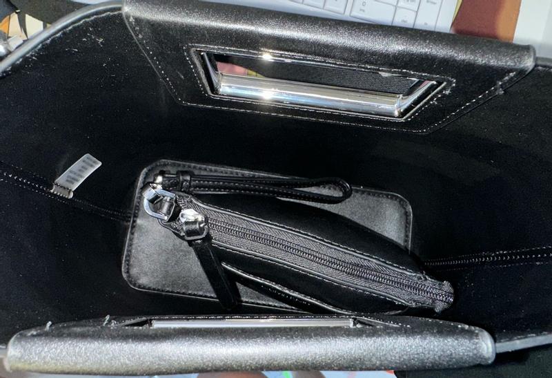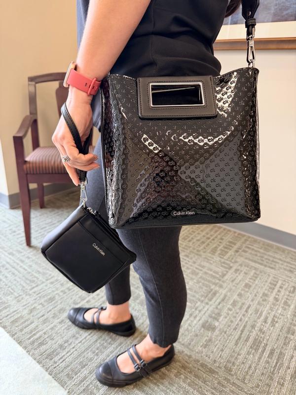 I’m impressed with this Calvin Klein medium crossbody purse. The purse is made with patent leather and it is soft. The thick canvas strap is removable and adjustable. You can wear it day time as a crossbody and midnight time as a strapless purse. The handle closure is magnetic. This set comes with a medium purse and a small wristlet pouch.