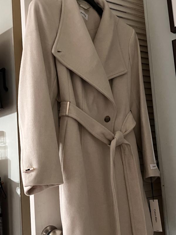 Calvin Klein hit it out of the park with this coat! Beautiful shawl collar also buttons at the neck with lovely buttons that match cuff buttons that look very couture. I bought the soft blue & white & it's beautiful. Fabric tends to pill due to its fleece like nature, but don't let that deter you because this coat is stunning & just enough wool in the fabric that isn't itchy. It doesnt feel cumbersome. Sleeves are plenty long. Love the silver metal belt carriers. The sizing chart is accurate for this coat. This is the prettiest plus size coat I've ever seen. First day out I had 3 compliments & asked where I got it. Of course I said Macy's!