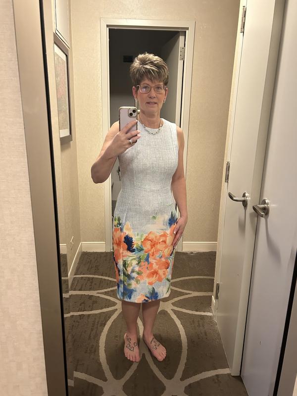 Love this beautiful sheath dress with its light blue and gorgeous orange flowers, it fits perfectly! I've been purchasing Calvin Klein clothing for at least 35-40 years and it's always right on target.