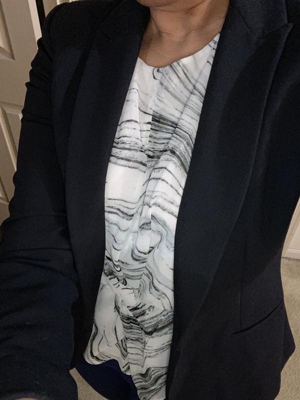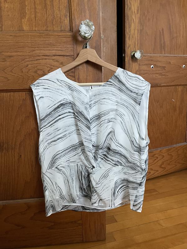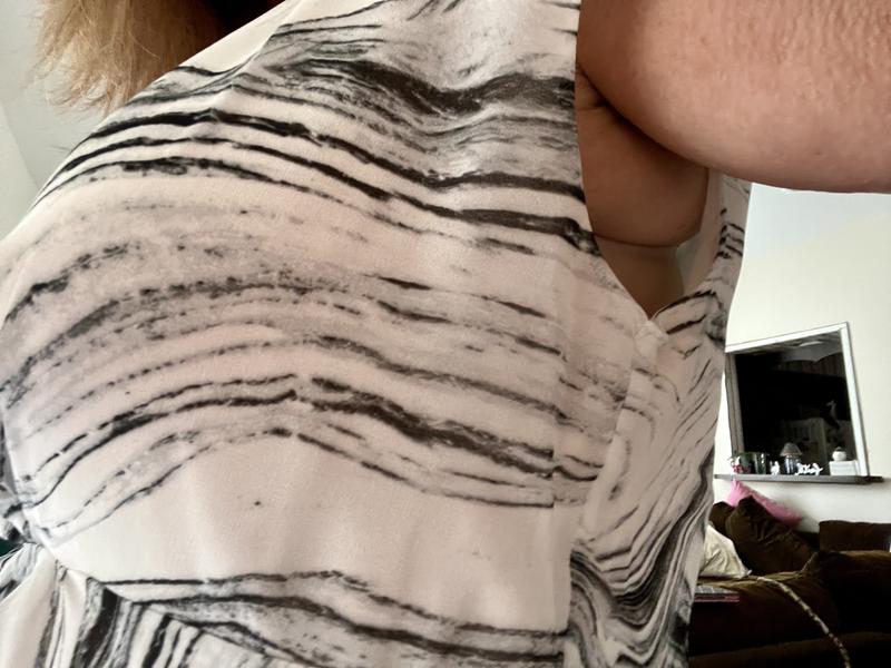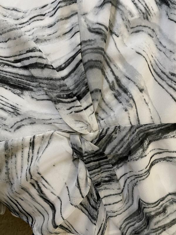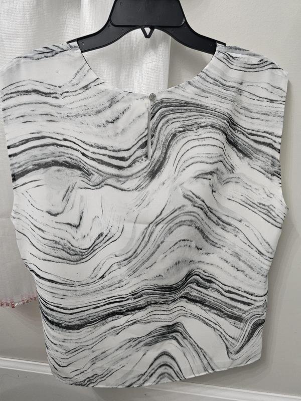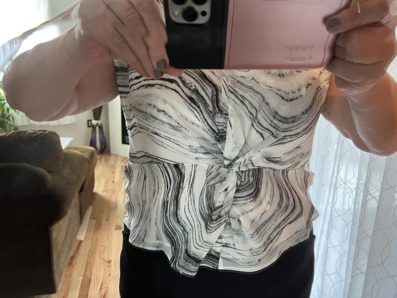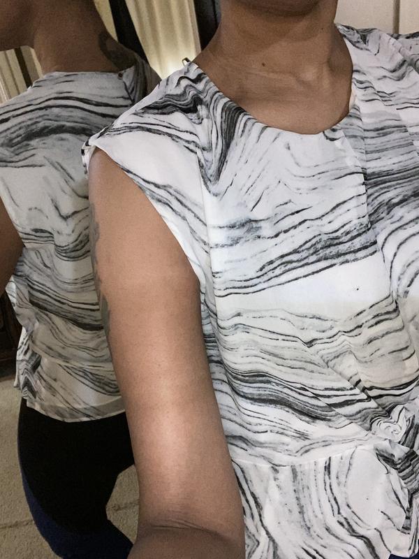 Cute top, fully lined, marble like black print on shiny white. Can be worn casual or can easily be dressed up! Lovely material, feels light and will be great for Spring / summer or can be worn with a light wrap which is how I wore it. Love the neck, cap sleeves and the waist detail which is a bit forgiving 😃 Got compliments for the look! Runs on the shorter side and small in my opinion.