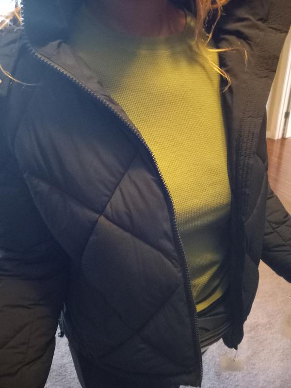 LOVE this black puffer coat. It's warm (but lightweight), the hood is detachable, and it's water-resistant! It's nice enough to wear to the office, as well as running errands. It fits nicely and there's a stretch to it, so I can wear a bulky sweater under comfortably. Love that the hoody is detachable. If you're going to buy any coat this winter season, THIS is the one you want to get!