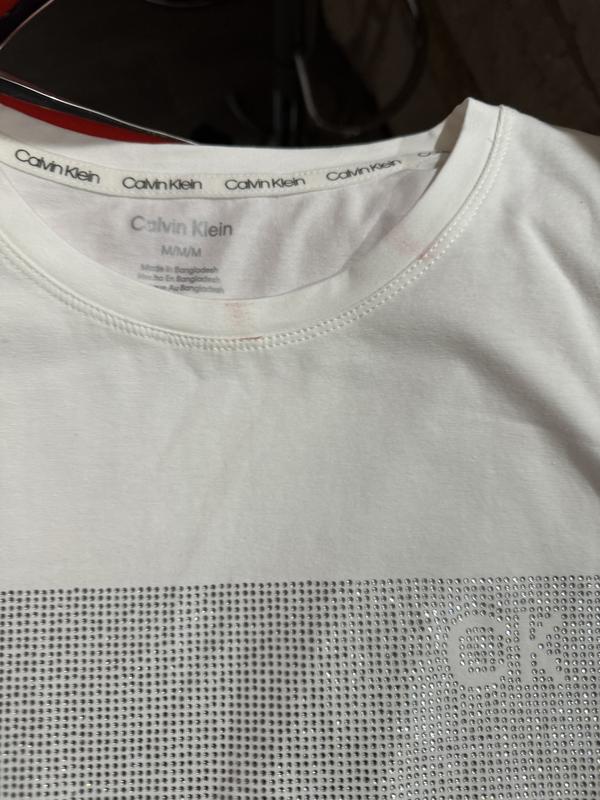 Nice stylish tee from Calvin Klein. Comfortable material and perfect length to pair with jeans. The middle of the shirt is sparkly, but definitely not gaudy. I would suggest washing inside out in cool water and like colors.
