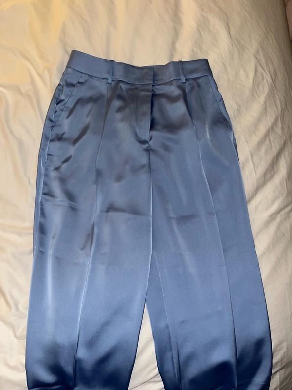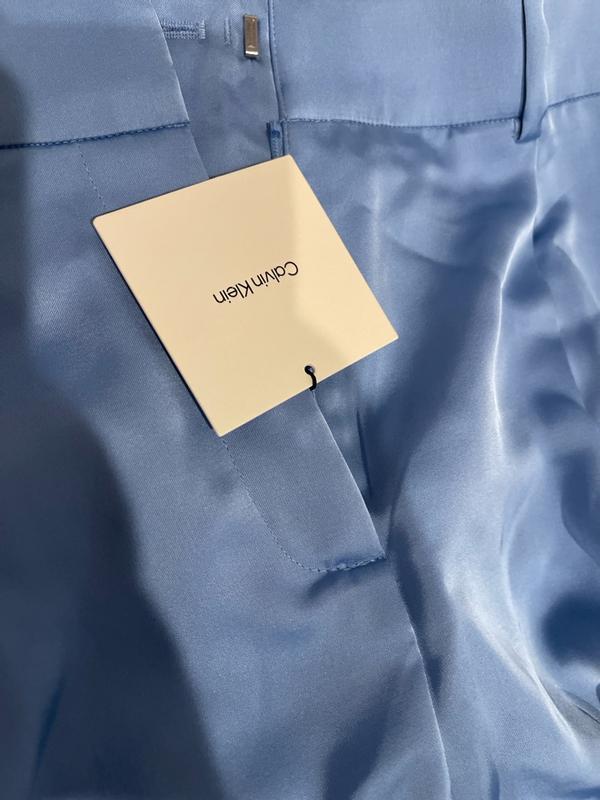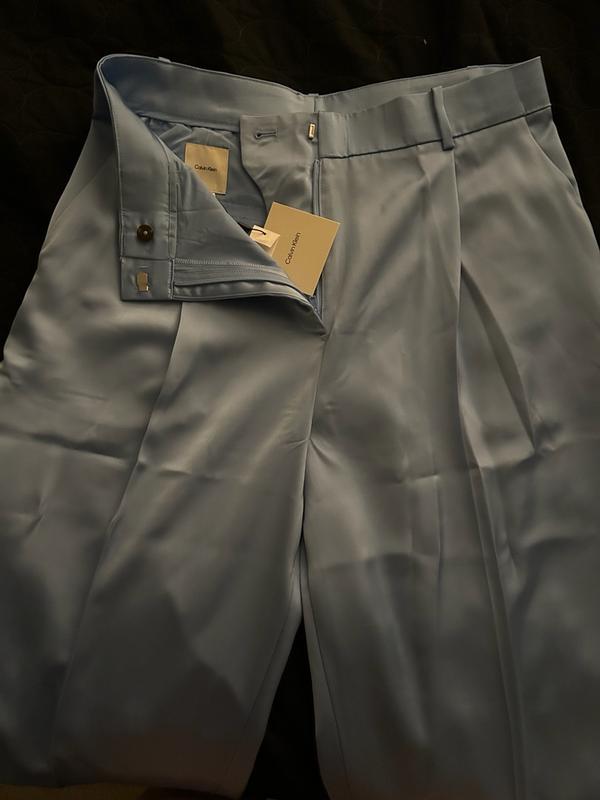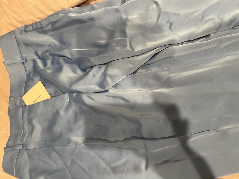Beautiful satin blue pants. Perfect for a night out or special event. I haven’t worn them yet but, plan to wear them to a luncheon next month. I’m normally a size 12 in CK but, found these to be a tight fit in the waist. I’m not worried about fit since I’m losing weight. I’m currently 175 but should fit around 160.