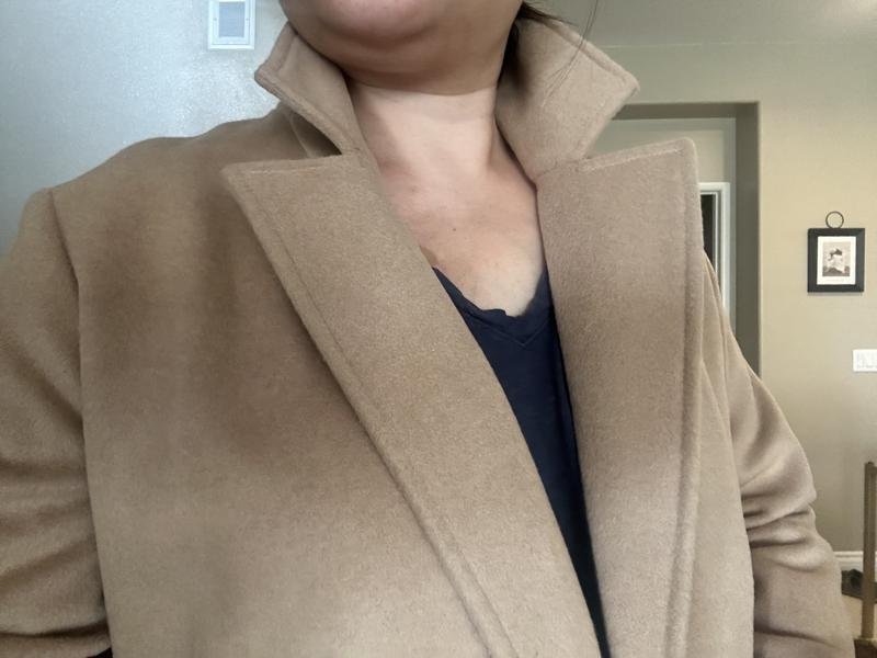 I really love the camel color - it looks very classy and expensive. The coat is pretty thick with a nice satin lining. However, this coat isn’t very flattering on me at all, even with the belt. I think it’s the pockets that make it look like I have added bulk on my hips.
