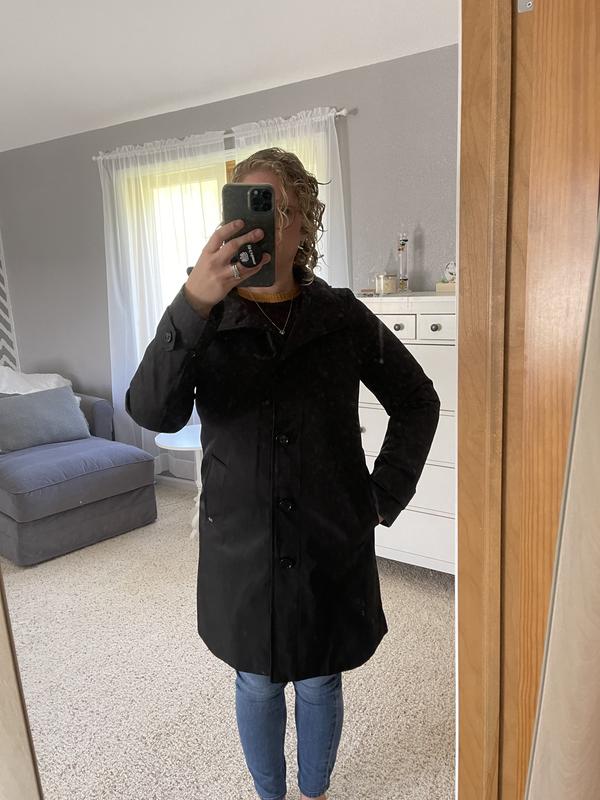 Was looking for a rain jacket and purchased this one online. I'm a petite size but need larger end of the scale. Like to buy a coat which doesn't need tailoring. Purchased this coat in a larger size, to large, so I returned it and went the store and was able to try on others and found a better choice.