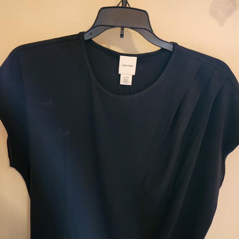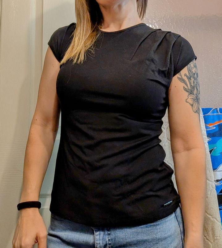 This shirt is slightly stretchy material, which makes it very flattering. The detail on the shoulder makes it look nice on you. It is durable material and comfortable.