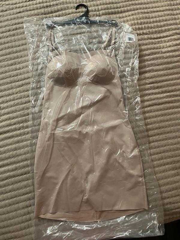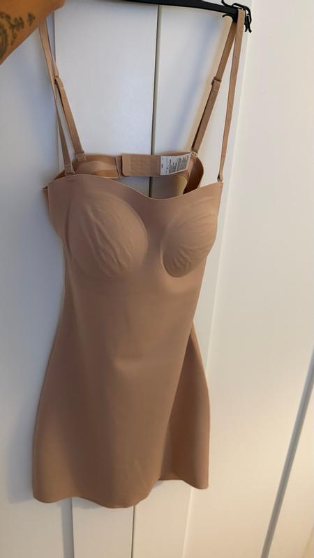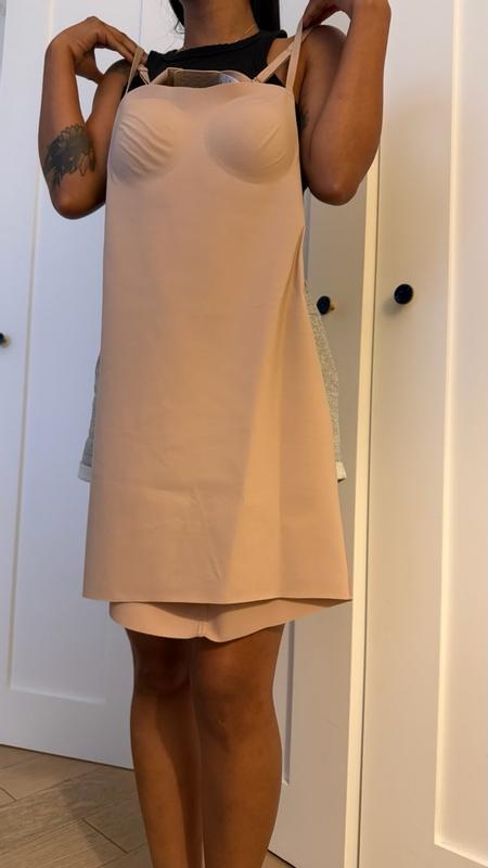 Very hard to get on and didn't really help shape my figure. My back fat spilled out between the slip and the bra strap area. While being soft on the outside, the inner side material feels rubbery and overall it's very constricting. The bra area gives some support and comes with nipple pads and you can't see through the slip which are nice features, I just didn't like that it didn't slim my figure like other shapewear has.
