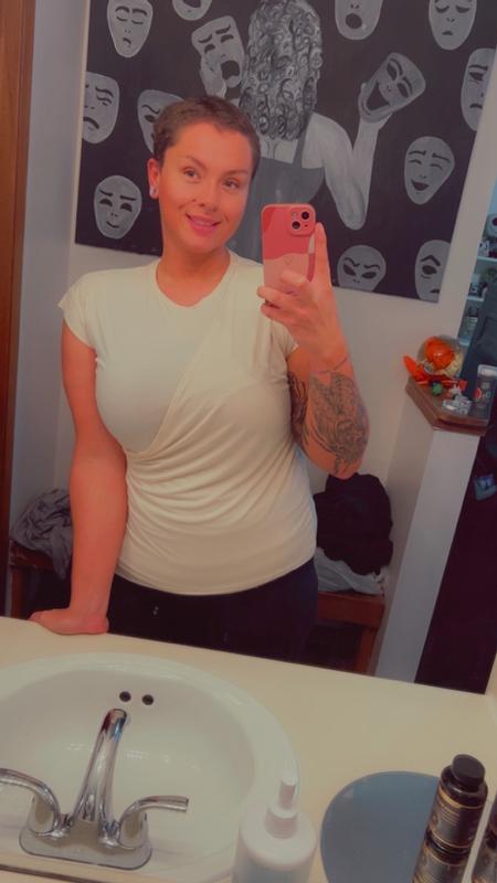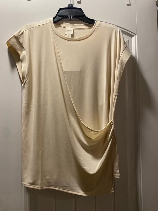 The fabric on this shirt just blows me away! It's so silky and cooling and the ruching on the bottom left adds a nice touch. The sleeves are a little short and they are more like cap sleeves, maybe even like a sleeveless shirt. Overall, this is a very sleek shirt perfect to wear to work.