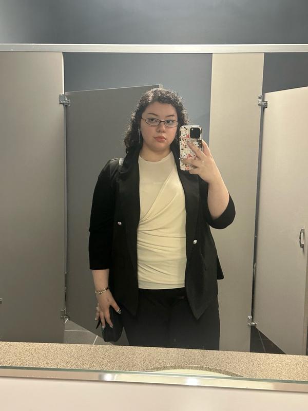 The material of this shirt is very soft and cool. It’s is very comfy, but is something I could definitely wear and style for work! I feel like this can be dressed up or dressed down. Wearing with a black bra underneath to show that it is slightly see through.