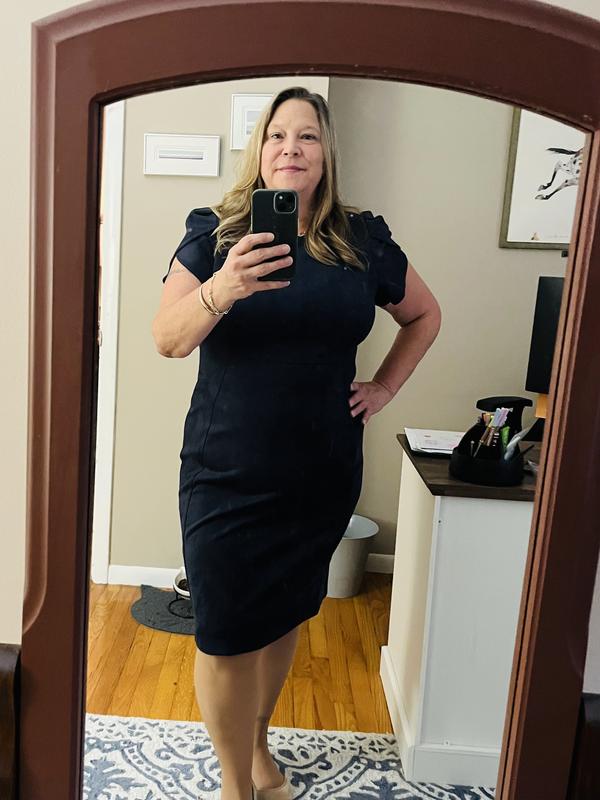 Navigate your busy day effortlessly in this Calvin Klein short dress, designed with a center-back zipper for easy dressing. The crewneck and tulip sleeves offer practical comfort for wear from morning to night.