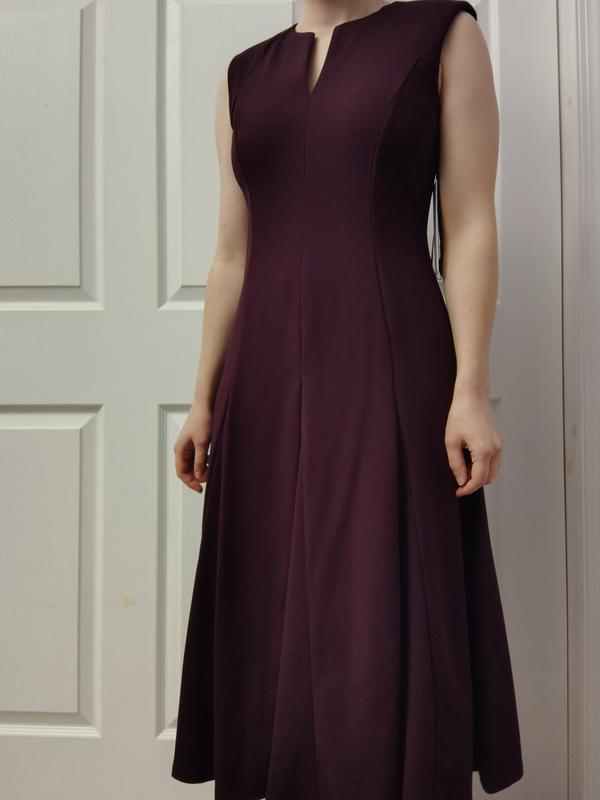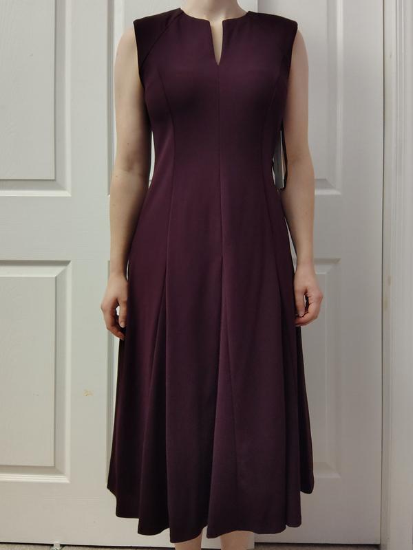 Great fit and aubergine is a very pretty color (a rich eggplant purple with a hint of plum-red). The neckline is flattering and isn't too deep for me. The length actually goes a few inches below the knee since I'm 5'3". Looks good to wear for multiple seasons and occasions, so I hope to get a lot of mileage out of this dress.