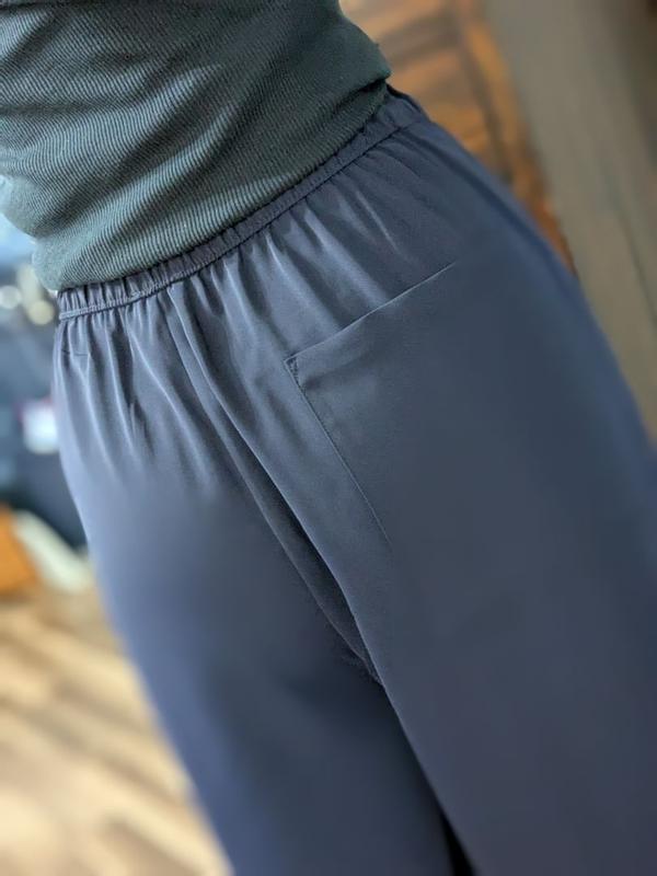 I like the color and fabric of these pants; however, they are not petite friendly! I am 5’2” and even in my tallest heels these graze the floor. They are super comfortable and light, I just wish they had length options.