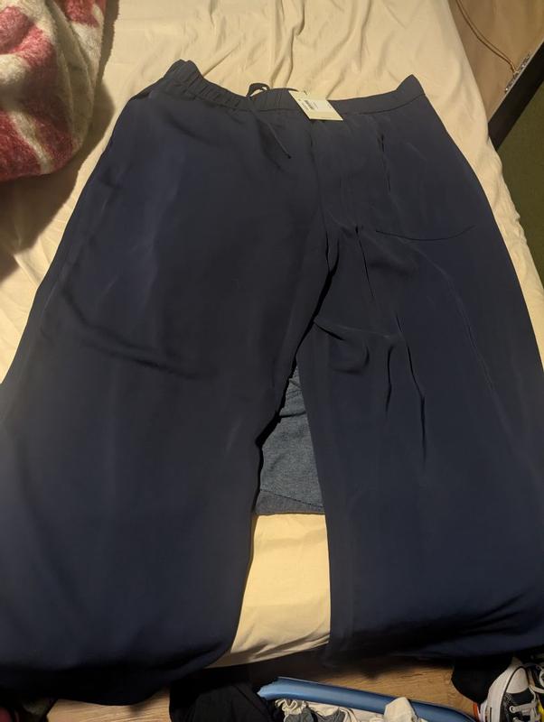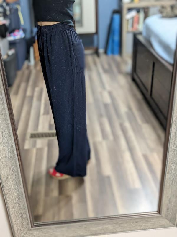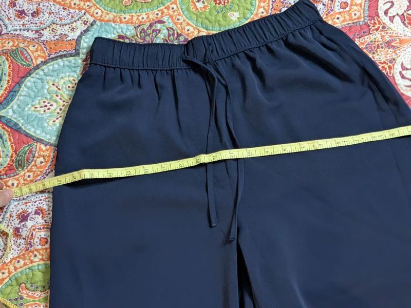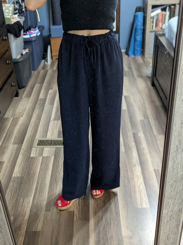 I was really disappointed with these pants especially ordering a small petite. I didn’t know it was an elastic drawstring but even the size and length are too big for me. I’m 5’4” and normally wear a size 0 or 2 so I thought this would fit fine. I also noticed a weird stain or mark on the front. It has stitching like it has a zipper in the front but it doesn’t. Some good things I’ll say - lightweight and not see thru and it has real pockets. Just wish it fit me better and didn’t have the mark in the front.